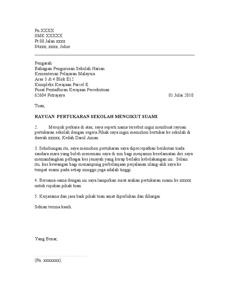 Contoh Surat Rayuan An Pertukaran Mengikut Suami Pdf
